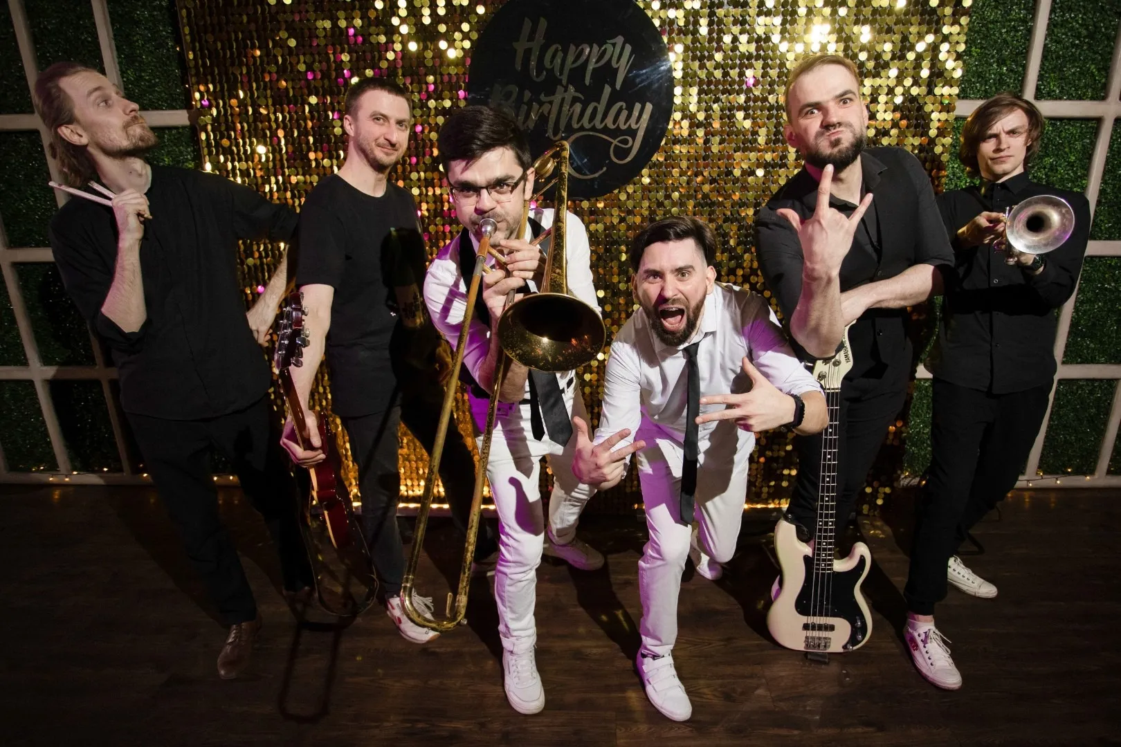 Если вам нужно эмоционально зарядиться, то вы пришли по адресу. Безудержное веселье, дикие танцы и необычные аранжировки любимых песен. Всё это ждет вас в компании наших ребят. Парни поставили рекорд по количеству восстановленного позитивного настроения. Были уличены в массовом целительном гипнозе. Не раз спасали планету от осенней хандры.