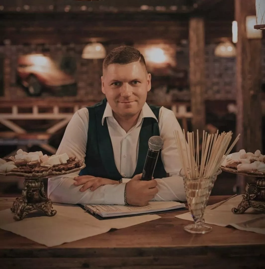 С 14 лет учился диджеингу, периодически практикуя с работой МС. Играл музыку и говорил в микрофон, пока коллега не предложил заняться ведением свадеб и корпоративов. И вот с 2003 года в свой творческий арсенал добавил вышеуказанные мероприятия.