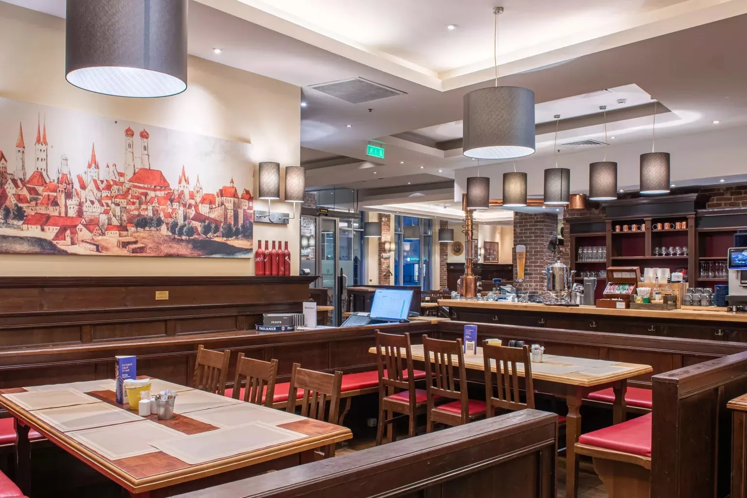 Просторные и светлые помещения бара-ресторана, рассчитанные сразу на 450 посадочных мест, занимают цокольный и первый этаж отеля Cosmos Saint-Petersburg Nevsky Hotel. Спокойный и лаконичный интерьер исполнен в традициях лучших пивных заведений.